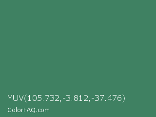 YUV 105.732,-3.812,-37.476 Color is a normal green color and the nearest color is Viridian #40826d. Hex code #3f8162 and RGB value is rgb(63,129,98). In RGB color space, this color is composed of 25% red, 51% green, 38% blue, In CMYK color space, this color is composed of 51% cyan, 0% magenta, 24% yellow , 49% black , In HSL color space, this color has a hue angle of 152° , 34% saturation and 38% lightness.