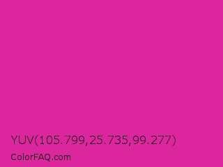 YUV 105.799,25.735,99.277 Color is a normal magenta color and the nearest color is Barbie Pink #e0218a. Hex code #db269e and RGB value is rgb(219,38,158). In RGB color space, this color is composed of 86% red, 15% green, 62% blue, In CMYK color space, this color is composed of 0% cyan, 83% magenta, 28% yellow , 14% black , In HSL color space, this color has a hue angle of 320° , 72% saturation and 50% lightness.