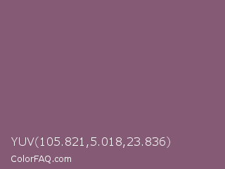 YUV 105.821,5.018,23.836 Color is a normal magenta color and the nearest color is Falcon #7f626d. Hex code #855a74 and RGB value is rgb(133,90,116). In RGB color space, this color is composed of 52% red, 35% green, 45% blue, In CMYK color space, this color is composed of 0% cyan, 32% magenta, 13% yellow , 48% black , In HSL color space, this color has a hue angle of 324° , 19% saturation and 44% lightness.