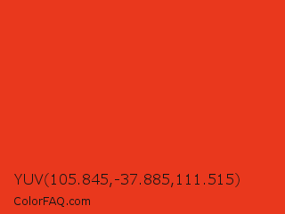 YUV 105.845,-37.885,111.515 Color is a normal red color and the nearest color is Vermilion #d9381e. Hex code #e9381d and RGB value is rgb(233,56,29). In RGB color space, this color is composed of 91% red, 22% green, 11% blue, In CMYK color space, this color is composed of 0% cyan, 76% magenta, 88% yellow , 9% black , In HSL color space, this color has a hue angle of 8° , 82% saturation and 51% lightness.