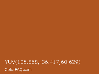 YUV 105.868,-36.417,60.629 Color is a normal orange color and the nearest color is Desert #ae6020. Hex code #af5520 and RGB value is rgb(175,85,32). In RGB color space, this color is composed of 69% red, 33% green, 13% blue, In CMYK color space, this color is composed of 0% cyan, 51% magenta, 82% yellow , 31% black , In HSL color space, this color has a hue angle of 22° , 69% saturation and 41% lightness.