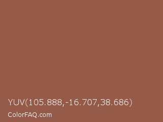 YUV 105.888,-16.707,38.686 Color is a normal red color and the nearest color is Coconut #965a3e. Hex code #965a48 and RGB value is rgb(150,90,72). In RGB color space, this color is composed of 59% red, 35% green, 28% blue, In CMYK color space, this color is composed of 0% cyan, 40% magenta, 52% yellow , 41% black , In HSL color space, this color has a hue angle of 14° , 35% saturation and 44% lightness.