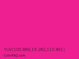 YUV 105.889,19.282,115.861 Color is a normal magenta color and the nearest color is Barbie Pink #e0218a. Hex code #ee1f91 and RGB value is rgb(238,31,145). In RGB color space, this color is composed of 93% red, 12% green, 57% blue, In CMYK color space, this color is composed of 0% cyan, 87% magenta, 39% yellow , 7% black , In HSL color space, this color has a hue angle of 327° , 86% saturation and 53% lightness.