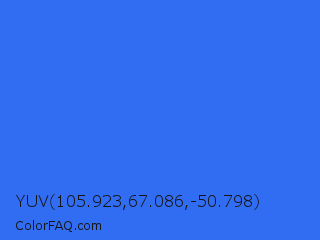 YUV 105.923,67.086,-50.798 Color is a normal blue color and the nearest color is Ultramarine Blue #4166f5. Hex code #306df2 and RGB value is rgb(48,109,242). In RGB color space, this color is composed of 19% red, 43% green, 95% blue, In CMYK color space, this color is composed of 80% cyan, 55% magenta, 0% yellow , 5% black , In HSL color space, this color has a hue angle of 221° , 88% saturation and 57% lightness.