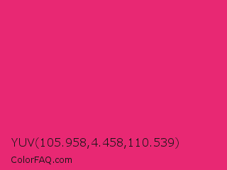 YUV 105.958,4.458,110.539 Color is a normal rose color and the nearest color is Razzmatazz #e3256b. Hex code #e82873 and RGB value is rgb(232,40,115). In RGB color space, this color is composed of 91% red, 16% green, 45% blue, In CMYK color space, this color is composed of 0% cyan, 83% magenta, 50% yellow , 9% black , In HSL color space, this color has a hue angle of 337° , 81% saturation and 53% lightness.
