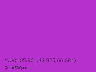 YUV 105.964,48.825,66.684 Color is a normal purple color and the nearest color is Steel Pink #cc33cc. Hex code #b630cd and RGB value is rgb(182,48,205). In RGB color space, this color is composed of 71% red, 19% green, 80% blue, In CMYK color space, this color is composed of 11% cyan, 77% magenta, 0% yellow , 20% black , In HSL color space, this color has a hue angle of 291° , 62% saturation and 50% lightness.