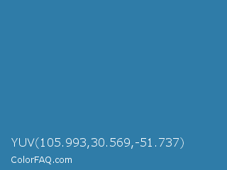 YUV 105.993,30.569,-51.737 Color is a normal blue color and the nearest color is Astral #327da0. Hex code #2f7ca8 and RGB value is rgb(47,124,168). In RGB color space, this color is composed of 18% red, 49% green, 66% blue, In CMYK color space, this color is composed of 72% cyan, 26% magenta, 0% yellow , 34% black , In HSL color space, this color has a hue angle of 202° , 56% saturation and 42% lightness.