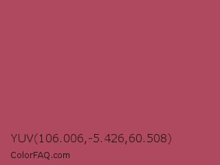 YUV 106.006,-5.426,60.508 Color is a normal red color and the nearest color is Hippie Pink #ae4560. Hex code #af495f and RGB value is rgb(175,73,95). In RGB color space, this color is composed of 69% red, 29% green, 37% blue, In CMYK color space, this color is composed of 0% cyan, 58% magenta, 46% yellow , 31% black , In HSL color space, this color has a hue angle of 347° , 41% saturation and 49% lightness.