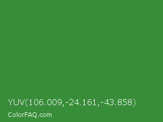 YUV 106.009,-24.161,-43.858 Color is a normal green color and the nearest color is May Green #4c9141. Hex code #388d39 and RGB value is rgb(56,141,57). In RGB color space, this color is composed of 22% red, 55% green, 22% blue, In CMYK color space, this color is composed of 60% cyan, 0% magenta, 60% yellow , 45% black , In HSL color space, this color has a hue angle of 121° , 43% saturation and 39% lightness.