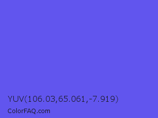 YUV 106.03,65.061,-7.919 Color is a light indigo color and the nearest color is Majorelle Blue #6050dc. Hex code #6155ee and RGB value is rgb(97,85,238). In RGB color space, this color is composed of 38% red, 33% green, 93% blue, In CMYK color space, this color is composed of 59% cyan, 64% magenta, 0% yellow , 7% black , In HSL color space, this color has a hue angle of 245° , 82% saturation and 63% lightness.