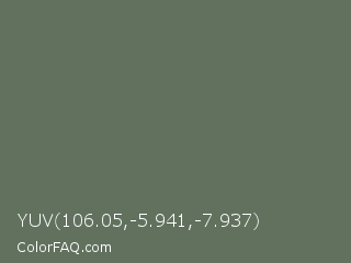 YUV 106.05,-5.941,-7.937 Color is a normal green color and the nearest color is Willow Grove #65745d. Hex code #61715e and RGB value is rgb(97,113,94). In RGB color space, this color is composed of 38% red, 44% green, 37% blue, In CMYK color space, this color is composed of 14% cyan, 0% magenta, 17% yellow , 56% black , In HSL color space, this color has a hue angle of 111° , 9% saturation and 41% lightness.