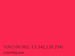 YUV 106.062,-13.342,126.234 Color is a normal red color and the nearest color is Awesome #ff2052. Hex code #fa264f and RGB value is rgb(250,38,79). In RGB color space, this color is composed of 98% red, 15% green, 31% blue, In CMYK color space, this color is composed of 0% cyan, 85% magenta, 68% yellow , 2% black , In HSL color space, this color has a hue angle of 348° , 95% saturation and 56% lightness.