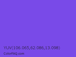 YUV 106.065,62.086,13.098 Color is a normal indigo color and the nearest color is Majorelle Blue #6050dc. Hex code #794ae8 and RGB value is rgb(121,74,232). In RGB color space, this color is composed of 47% red, 29% green, 91% blue, In CMYK color space, this color is composed of 48% cyan, 68% magenta, 0% yellow , 9% black , In HSL color space, this color has a hue angle of 258° , 77% saturation and 60% lightness.