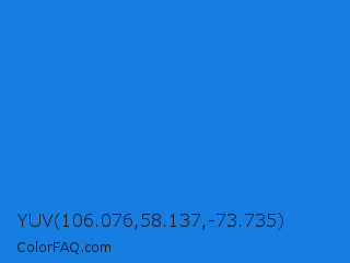 YUV 106.076,58.137,-73.735 Color is a normal blue color and the nearest color is Bright Navy Blue #1974d2. Hex code #167ee0 and RGB value is rgb(22,126,224). In RGB color space, this color is composed of 9% red, 49% green, 88% blue, In CMYK color space, this color is composed of 90% cyan, 44% magenta, 0% yellow , 12% black , In HSL color space, this color has a hue angle of 209° , 82% saturation and 48% lightness.