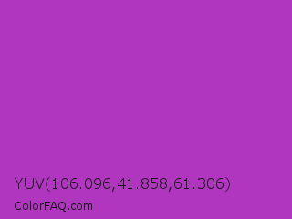 YUV 106.096,41.858,61.306 Color is a normal magenta color and the nearest color is Dark Orchid #9932cc. Hex code #b036bf and RGB value is rgb(176,54,191). In RGB color space, this color is composed of 69% red, 21% green, 75% blue, In CMYK color space, this color is composed of 8% cyan, 72% magenta, 0% yellow , 25% black , In HSL color space, this color has a hue angle of 293° , 56% saturation and 48% lightness.