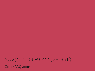 YUV 106.09,-9.411,78.851 Color is a normal red color and the nearest color is Brick Red #cb4154. Hex code #c44057 and RGB value is rgb(196,64,87). In RGB color space, this color is composed of 77% red, 25% green, 34% blue, In CMYK color space, this color is composed of 0% cyan, 67% magenta, 56% yellow , 23% black , In HSL color space, this color has a hue angle of 350° , 53% saturation and 51% lightness.