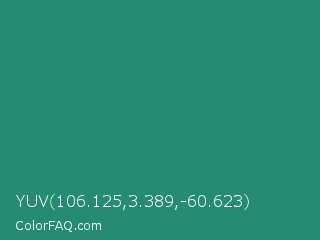 YUV 106.125,3.389,-60.623 Color is a normal cyan color and the nearest color is Illuminating Emerald #319177. Hex code #258c71 and RGB value is rgb(37,140,113). In RGB color space, this color is composed of 15% red, 55% green, 44% blue, In CMYK color space, this color is composed of 74% cyan, 0% magenta, 19% yellow , 45% black , In HSL color space, this color has a hue angle of 164° , 58% saturation and 35% lightness.