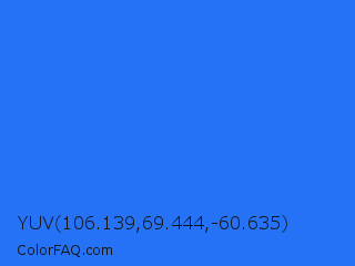 YUV 106.139,69.444,-60.635 Color is a normal blue color and the nearest color is Blue Crayola #1f75fe. Hex code #2572f7 and RGB value is rgb(37,114,247). In RGB color space, this color is composed of 15% red, 45% green, 97% blue, In CMYK color space, this color is composed of 85% cyan, 54% magenta, 0% yellow , 3% black , In HSL color space, this color has a hue angle of 218° , 93% saturation and 56% lightness.
