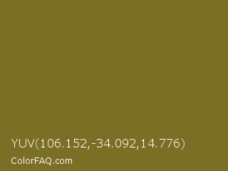 YUV 106.152,-34.092,14.776 Color is a normal yellow color and the nearest color is Crete #737829. Hex code #7b6f25 and RGB value is rgb(123,111,37). In RGB color space, this color is composed of 48% red, 44% green, 15% blue, In CMYK color space, this color is composed of 0% cyan, 10% magenta, 70% yellow , 52% black , In HSL color space, this color has a hue angle of 52° , 54% saturation and 31% lightness.