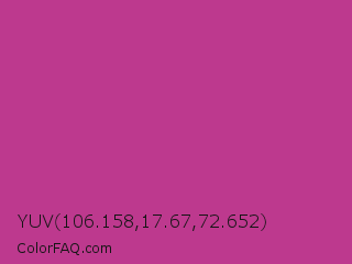 YUV 106.158,17.67,72.652 Color is a normal magenta color and the nearest color is Medium Red Violet #bb3385. Hex code #bd398e and RGB value is rgb(189,57,142). In RGB color space, this color is composed of 74% red, 22% green, 56% blue, In CMYK color space, this color is composed of 0% cyan, 70% magenta, 25% yellow , 26% black , In HSL color space, this color has a hue angle of 321° , 54% saturation and 48% lightness.