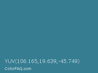 YUV 106.165,19.639,-45.749 Color is a normal blue color and the nearest color is Teal Blue #367588. Hex code #367d92 and RGB value is rgb(54,125,146). In RGB color space, this color is composed of 21% red, 49% green, 57% blue, In CMYK color space, this color is composed of 63% cyan, 14% magenta, 0% yellow , 43% black , In HSL color space, this color has a hue angle of 194° , 46% saturation and 39% lightness.