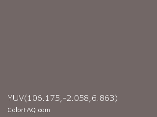 YUV 106.175,-2.058,6.863 Color is a normal red color and the nearest color is Flint #6f6a61. Hex code #726766 and RGB value is rgb(114,103,102). In RGB color space, this color is composed of 45% red, 40% green, 40% blue, In CMYK color space, this color is composed of 0% cyan, 10% magenta, 11% yellow , 55% black , In HSL color space, this color has a hue angle of 5° , 6% saturation and 42% lightness.