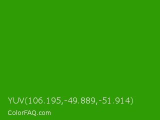 YUV 106.195,-49.889,-51.914 Color is a normal green color and the nearest color is Slimy Green #299617. Hex code #2f9c05 and RGB value is rgb(47,156,5). In RGB color space, this color is composed of 18% red, 61% green, 2% blue, In CMYK color space, this color is composed of 70% cyan, 0% magenta, 97% yellow , 39% black , In HSL color space, this color has a hue angle of 103° , 94% saturation and 32% lightness.