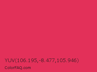 YUV 106.195,-8.477,105.946 Color is a normal red color and the nearest color is Amaranth #e52b50. Hex code #e33059 and RGB value is rgb(227,48,89). In RGB color space, this color is composed of 89% red, 19% green, 35% blue, In CMYK color space, this color is composed of 0% cyan, 79% magenta, 61% yellow , 11% black , In HSL color space, this color has a hue angle of 346° , 76% saturation and 54% lightness.