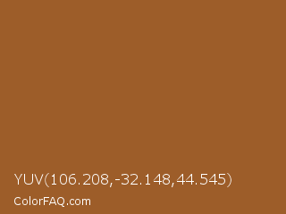 YUV 106.208,-32.148,44.545 Color is a normal orange color and the nearest color is Paarl #a65529. Hex code #9d5d29 and RGB value is rgb(157,93,41). In RGB color space, this color is composed of 62% red, 36% green, 16% blue, In CMYK color space, this color is composed of 0% cyan, 41% magenta, 74% yellow , 38% black , In HSL color space, this color has a hue angle of 27° , 59% saturation and 39% lightness.