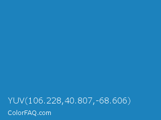 YUV 106.228,40.807,-68.606 Color is a normal blue color and the nearest color is Cyan Cornflower Blue #188bc2. Hex code #1c82bd and RGB value is rgb(28,130,189). In RGB color space, this color is composed of 11% red, 51% green, 74% blue, In CMYK color space, this color is composed of 85% cyan, 31% magenta, 0% yellow , 26% black , In HSL color space, this color has a hue angle of 202° , 74% saturation and 43% lightness.