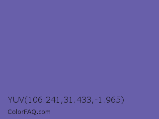YUV 106.241,31.433,-1.965 Color is a normal indigo color and the nearest color is Scampi #675fa6. Hex code #685faa and RGB value is rgb(104,95,170). In RGB color space, this color is composed of 41% red, 37% green, 67% blue, In CMYK color space, this color is composed of 39% cyan, 44% magenta, 0% yellow , 33% black , In HSL color space, this color has a hue angle of 247° , 31% saturation and 52% lightness.