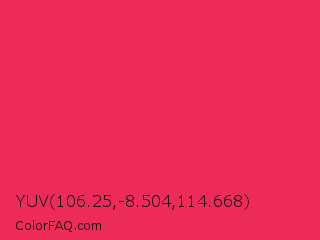 YUV 106.25,-8.504,114.668 Color is a normal red color and the nearest color is Amaranth #e52b50. Hex code #ed2b59 and RGB value is rgb(237,43,89). In RGB color space, this color is composed of 93% red, 17% green, 35% blue, In CMYK color space, this color is composed of 0% cyan, 82% magenta, 62% yellow , 7% black , In HSL color space, this color has a hue angle of 346° , 84% saturation and 55% lightness.