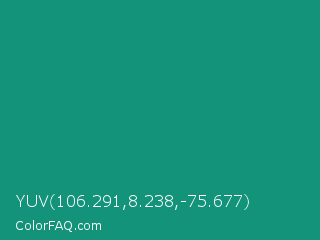 YUV 106.291,8.238,-75.677 Color is a normal cyan color and the nearest color is Gossamer #069b81. Hex code #14937b and RGB value is rgb(20,147,123). In RGB color space, this color is composed of 8% red, 58% green, 48% blue, In CMYK color space, this color is composed of 86% cyan, 0% magenta, 16% yellow , 42% black , In HSL color space, this color has a hue angle of 169° , 76% saturation and 33% lightness.