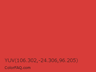 YUV 106.302,-24.306,96.205 Color is a normal red color and the nearest color is Jasper #d73b3e. Hex code #d83c39 and RGB value is rgb(216,60,57). In RGB color space, this color is composed of 85% red, 24% green, 22% blue, In CMYK color space, this color is composed of 0% cyan, 72% magenta, 74% yellow , 15% black , In HSL color space, this color has a hue angle of 1° , 67% saturation and 54% lightness.