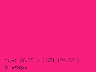 YUV 106.354,10.671,124.224 Color is a normal rose color and the nearest color is Fluorescent Pink #ff1493. Hex code #f81e80 and RGB value is rgb(248,30,128). In RGB color space, this color is composed of 97% red, 12% green, 50% blue, In CMYK color space, this color is composed of 0% cyan, 88% magenta, 48% yellow , 3% black , In HSL color space, this color has a hue angle of 333° , 94% saturation and 55% lightness.