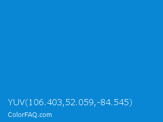 YUV 106.403,52.059,-84.545 Color is a normal blue color and the nearest color is Rich Electric Blue #0892d0. Hex code #0a87d4 and RGB value is rgb(10,135,212). In RGB color space, this color is composed of 4% red, 53% green, 83% blue, In CMYK color space, this color is composed of 95% cyan, 36% magenta, 0% yellow , 17% black , In HSL color space, this color has a hue angle of 203° , 91% saturation and 44% lightness.