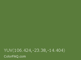 YUV 106.424,-23.38,-14.404 Color is a normal green color and the nearest color is Dingley #5d7747. Hex code #5a7c3b and RGB value is rgb(90,124,59). In RGB color space, this color is composed of 35% red, 49% green, 23% blue, In CMYK color space, this color is composed of 27% cyan, 0% magenta, 52% yellow , 51% black , In HSL color space, this color has a hue angle of 91° , 36% saturation and 36% lightness.