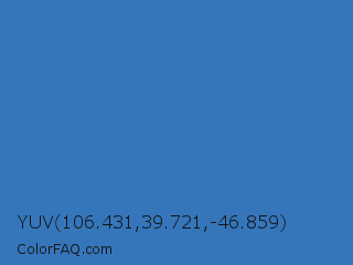 YUV 106.431,39.721,-46.859 Color is a normal blue color and the nearest color is Cyan Blue Azure #4682bf. Hex code #3576bb and RGB value is rgb(53,118,187). In RGB color space, this color is composed of 21% red, 46% green, 73% blue, In CMYK color space, this color is composed of 72% cyan, 37% magenta, 0% yellow , 27% black , In HSL color space, this color has a hue angle of 211° , 56% saturation and 47% lightness.