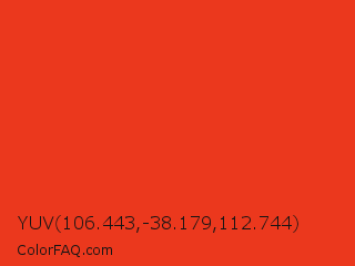 YUV 106.443,-38.179,112.744 Color is a normal red color and the nearest color is Vermilion #d9381e. Hex code #eb381d and RGB value is rgb(235,56,29). In RGB color space, this color is composed of 92% red, 22% green, 11% blue, In CMYK color space, this color is composed of 0% cyan, 76% magenta, 88% yellow , 8% black , In HSL color space, this color has a hue angle of 8° , 84% saturation and 52% lightness.