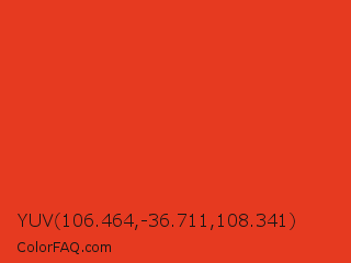 YUV 106.464,-36.711,108.341 Color is a normal red color and the nearest color is Vermilion #d9381e. Hex code #e63a20 and RGB value is rgb(230,58,32). In RGB color space, this color is composed of 90% red, 23% green, 13% blue, In CMYK color space, this color is composed of 0% cyan, 75% magenta, 86% yellow , 10% black , In HSL color space, this color has a hue angle of 8° , 80% saturation and 51% lightness.