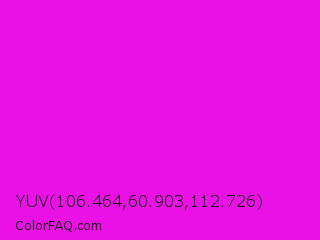 YUV 106.464,60.903,112.726 Color is a normal magenta color and the nearest color is Phlox #df00ff. Hex code #eb11e6 and RGB value is rgb(235,17,230). In RGB color space, this color is composed of 92% red, 7% green, 90% blue, In CMYK color space, this color is composed of 0% cyan, 93% magenta, 2% yellow , 8% black , In HSL color space, this color has a hue angle of 301° , 87% saturation and 49% lightness.