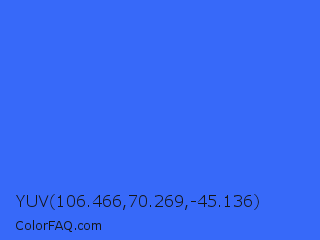 YUV 106.466,70.269,-45.136 Color is a normal blue color and the nearest color is Ultramarine Blue #4166f5. Hex code #3769f9 and RGB value is rgb(55,105,249). In RGB color space, this color is composed of 22% red, 41% green, 98% blue, In CMYK color space, this color is composed of 78% cyan, 58% magenta, 0% yellow , 2% black , In HSL color space, this color has a hue angle of 225° , 94% saturation and 60% lightness.