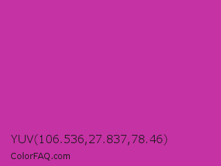 YUV 106.536,27.837,78.46 Color is a normal magenta color and the nearest color is Byzantine #bd33a4. Hex code #c432a3 and RGB value is rgb(196,50,163). In RGB color space, this color is composed of 77% red, 20% green, 64% blue, In CMYK color space, this color is composed of 0% cyan, 74% magenta, 17% yellow , 23% black , In HSL color space, this color has a hue angle of 314° , 59% saturation and 48% lightness.