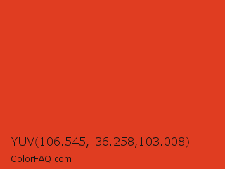 YUV 106.545,-36.258,103.008 Color is a normal red color and the nearest color is Vermilion #d9381e. Hex code #e03d21 and RGB value is rgb(224,61,33). In RGB color space, this color is composed of 88% red, 24% green, 13% blue, In CMYK color space, this color is composed of 0% cyan, 73% magenta, 85% yellow , 12% black , In HSL color space, this color has a hue angle of 9° , 75% saturation and 50% lightness.