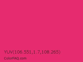 YUV 106.551,1.7,108.265 Color is a normal rose color and the nearest color is Razzmatazz #e3256b. Hex code #e62b6e and RGB value is rgb(230,43,110). In RGB color space, this color is composed of 90% red, 17% green, 43% blue, In CMYK color space, this color is composed of 0% cyan, 81% magenta, 52% yellow , 10% black , In HSL color space, this color has a hue angle of 339° , 79% saturation and 54% lightness.