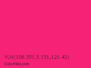 YUV 106.551,5.151,121.42 Color is a normal rose color and the nearest color is Razzmatazz #e3256b. Hex code #f52275 and RGB value is rgb(245,34,117). In RGB color space, this color is composed of 96% red, 13% green, 46% blue, In CMYK color space, this color is composed of 0% cyan, 86% magenta, 52% yellow , 4% black , In HSL color space, this color has a hue angle of 336° , 91% saturation and 55% lightness.