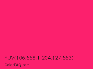 YUV 106.558,1.204,127.553 Color is a normal rose color and the nearest color is Razzmatazz #e3256b. Hex code #fc206d and RGB value is rgb(252,32,109). In RGB color space, this color is composed of 99% red, 13% green, 43% blue, In CMYK color space, this color is composed of 0% cyan, 87% magenta, 57% yellow , 1% black , In HSL color space, this color has a hue angle of 339° , 97% saturation and 56% lightness.