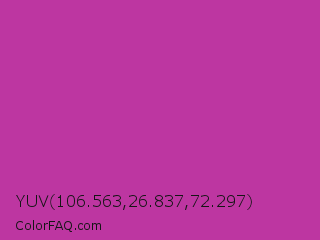 YUV 106.563,26.837,72.297 Color is a normal magenta color and the nearest color is Byzantine #bd33a4. Hex code #bd36a1 and RGB value is rgb(189,54,161). In RGB color space, this color is composed of 74% red, 21% green, 63% blue, In CMYK color space, this color is composed of 0% cyan, 71% magenta, 15% yellow , 26% black , In HSL color space, this color has a hue angle of 312° , 56% saturation and 48% lightness.