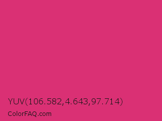 YUV 106.582,4.643,97.714 Color is a normal rose color and the nearest color is Telemagenta #cf3476. Hex code #da3074 and RGB value is rgb(218,48,116). In RGB color space, this color is composed of 85% red, 19% green, 45% blue, In CMYK color space, this color is composed of 0% cyan, 78% magenta, 47% yellow , 15% black , In HSL color space, this color has a hue angle of 336° , 70% saturation and 52% lightness.