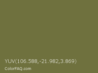 YUV 106.588,-21.982,3.869 Color is a normal yellow color and the nearest color is Yellow Metal #716338. Hex code #6f713e and RGB value is rgb(111,113,62). In RGB color space, this color is composed of 44% red, 44% green, 24% blue, In CMYK color space, this color is composed of 2% cyan, 0% magenta, 45% yellow , 56% black , In HSL color space, this color has a hue angle of 62° , 29% saturation and 34% lightness.